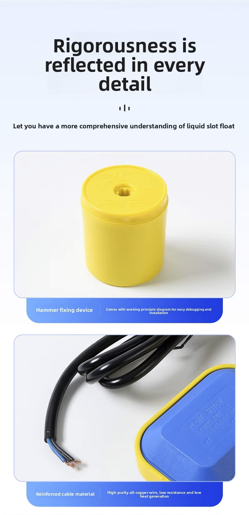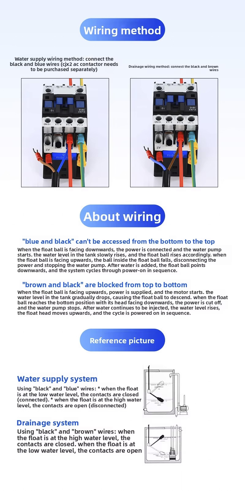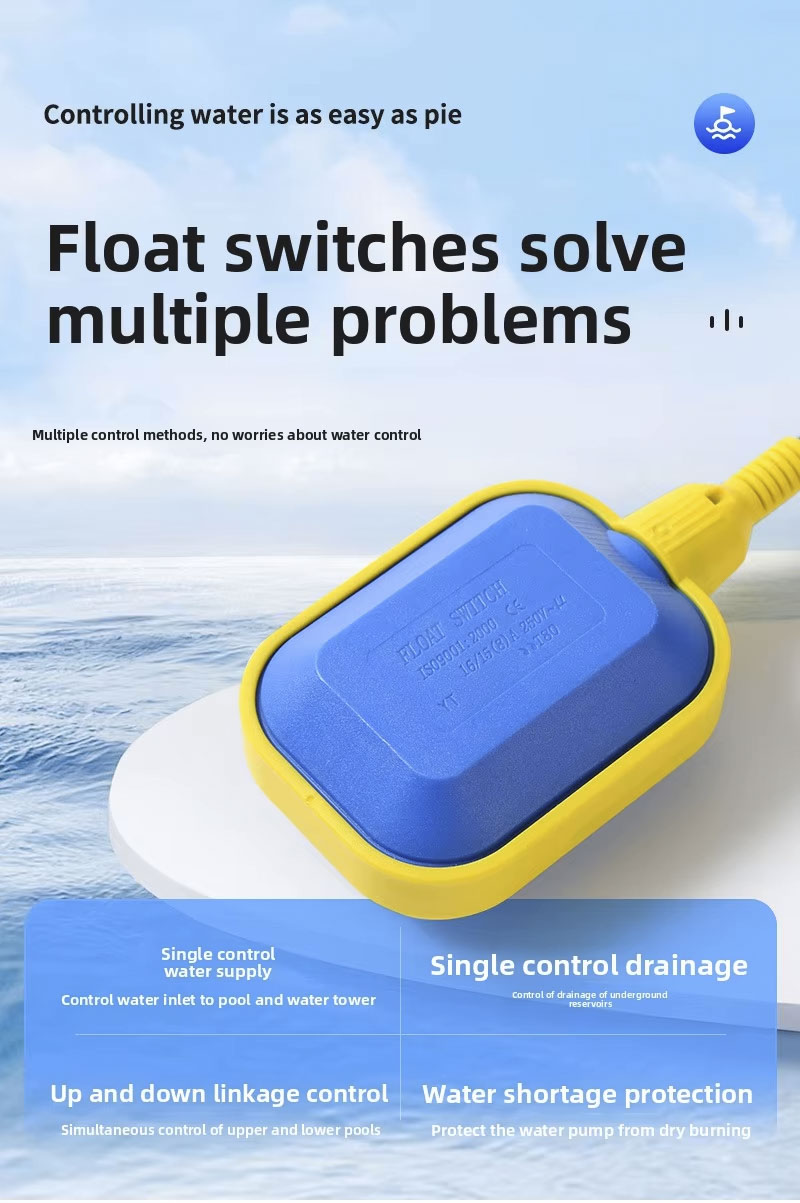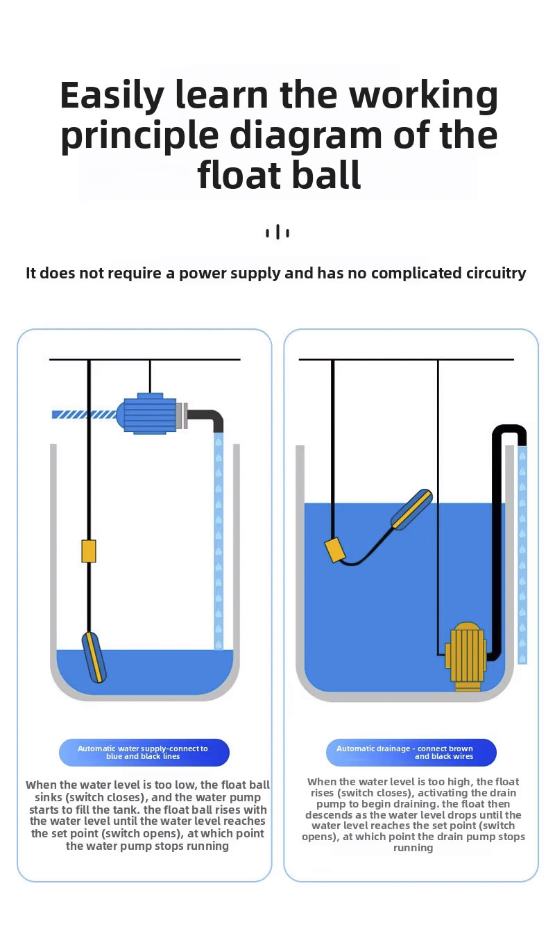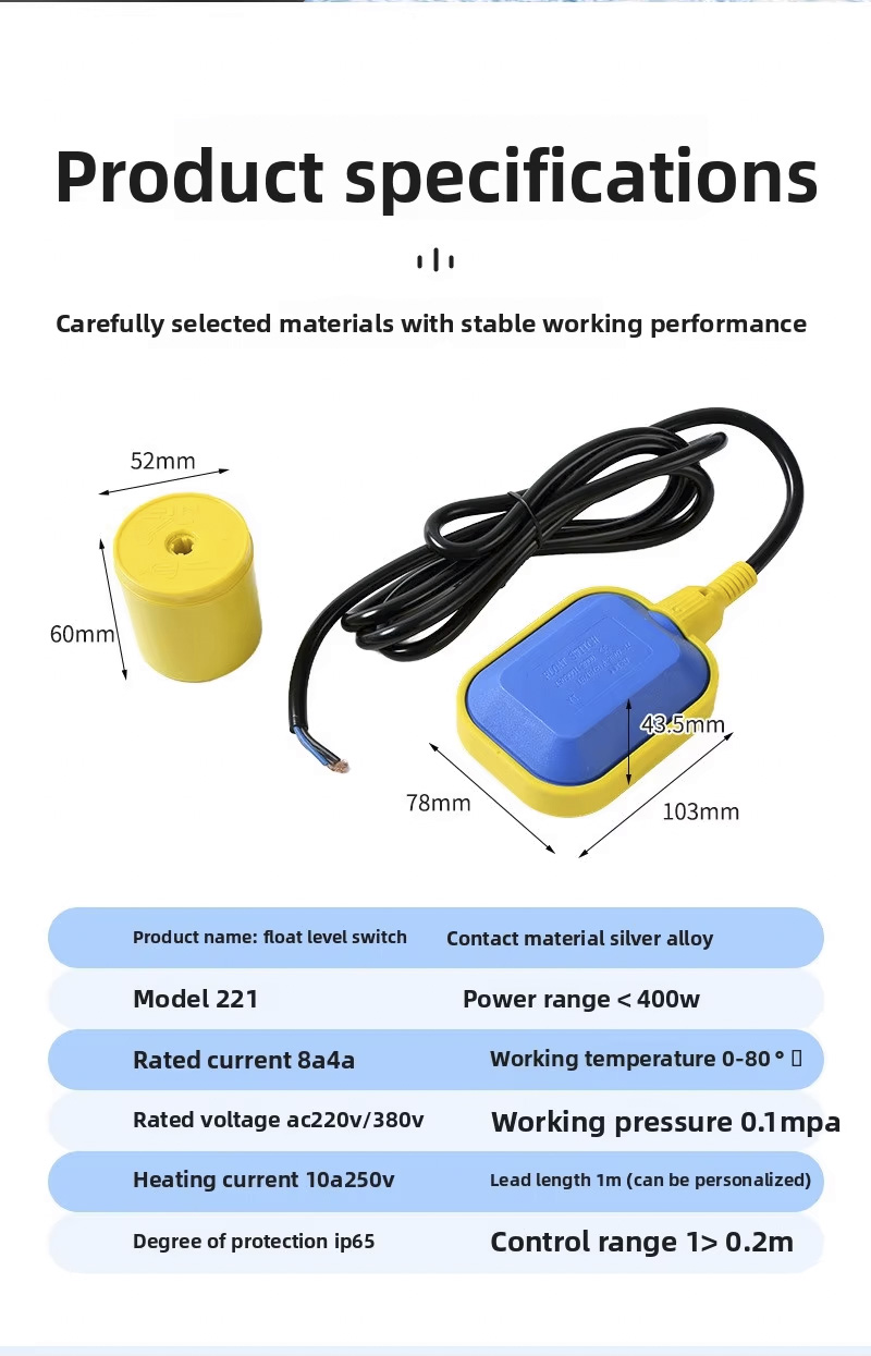 या फ्लोट स्विचमध्ये 2m、3m、5m、10m,IP68 प्रोटेक्शन ग्रेडसह एक मोठे वर्तुळाकार डिझाइन आहे आणि ते 0℃ ते 80℃ तापमानात चालते,हे 110V ते 220V च्या विस्तृत व्होल्टेज श्रेणीला सपोर्ट करते आणि ±0.5M ला सानुकूलित उत्पादन lasspagrav चा मजबूत वर्किंग प्रेशर आहे. लोगो किंवा OEM/ODM सेवा, विविध अनुप्रयोगांसाठी अनुकूलता सुनिश्चित करणे.