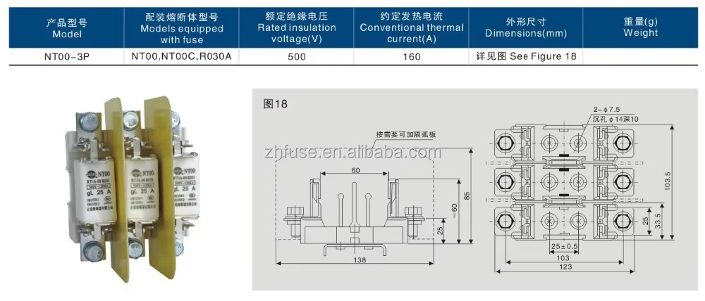 फ्यूजच्या या मालिकेमध्ये फ्यूज लिंक आणि फ्यूज धारक असतात. एनटी 00-3 पी फ्यूज बेस पाचर-आकाराच्या संमिश्र स्थिर संपर्कांसह उच्च-शक्ती सिरेमिक फ्लोअरिंग किंवा उच्च-तापमान राळ फ्लोअरिंगपासून बनलेला आहे. चांगली उष्णता अपव्यय, उच्च यांत्रिक सामर्थ्य, विश्वासार्ह कनेक्शन आणि सुलभ ऑपरेशनसह ही एक मुक्त रचना आहे. एनटी 00-3 पी फ्यूज बेस या मालिकेशी सुसंगत आहे आणि एनएच फ्यूज पुलर बेसमधून फ्यूज काढण्यासाठी वापरला जातो. शुद्ध तांबे किंवा चांदीच्या चादरीने बनविलेले फ्यूज लिंक (किंवा चांदीच्या वायर) उच्च-शक्तीच्या सिरेमिकपासून बनविलेल्या वितळलेल्या ट्यूबमध्ये सीलबंद केले जाते.