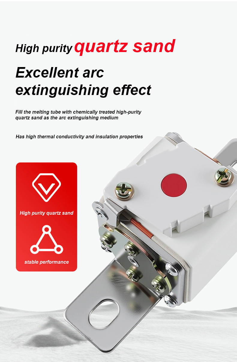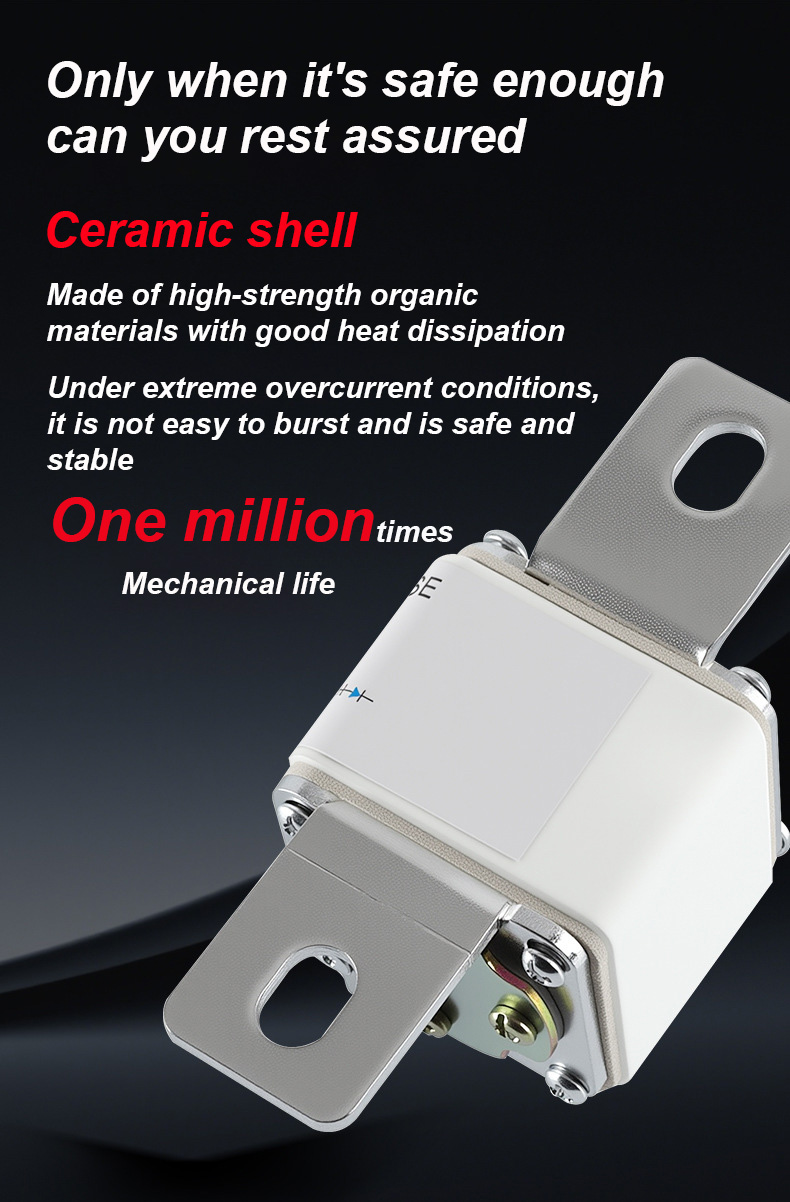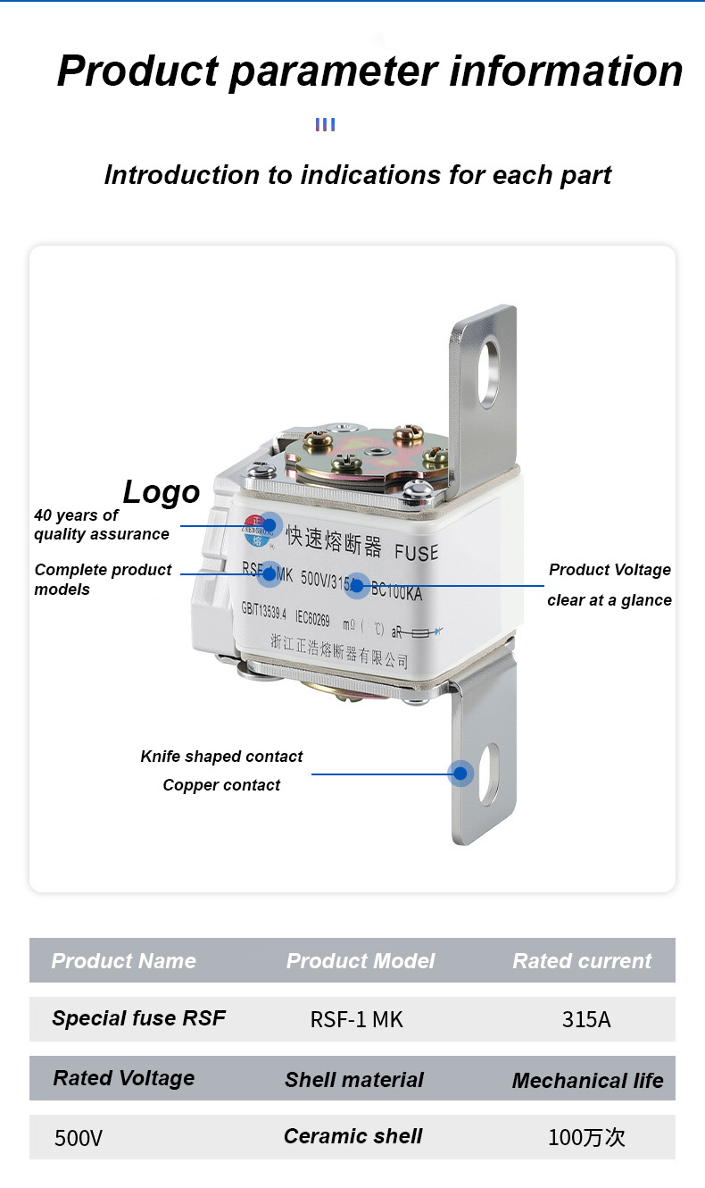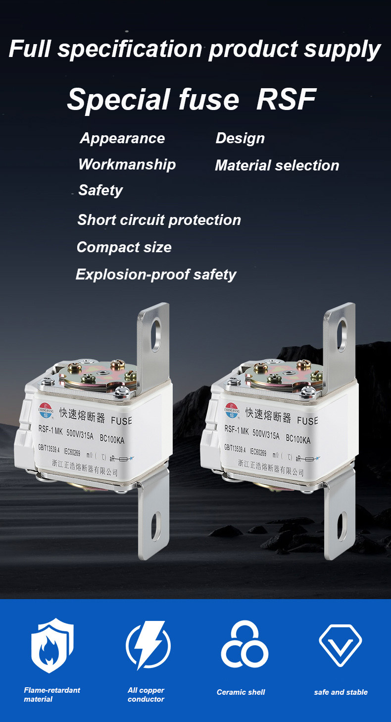 500V चा रेट केलेला व्होल्टेज आणि 315A रेट केलेला प्रवाह आहे, जो प्रभावीपणे विद्युत सुरक्षितता सुनिश्चित करू शकतो, ओव्हरलोड आणि शॉर्ट सर्किट टाळू शकतो. RSF-1K 500V-315A BC100KA फ्यूज लिंक्स
