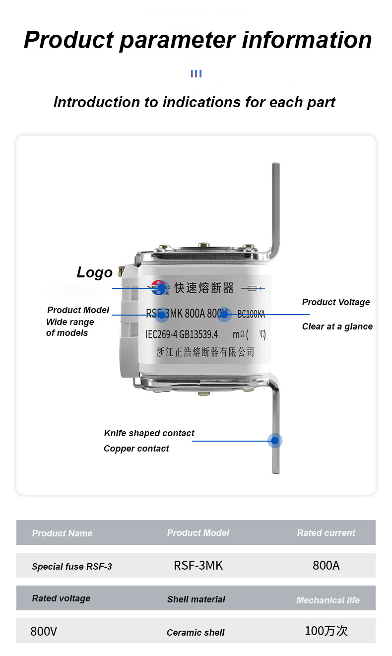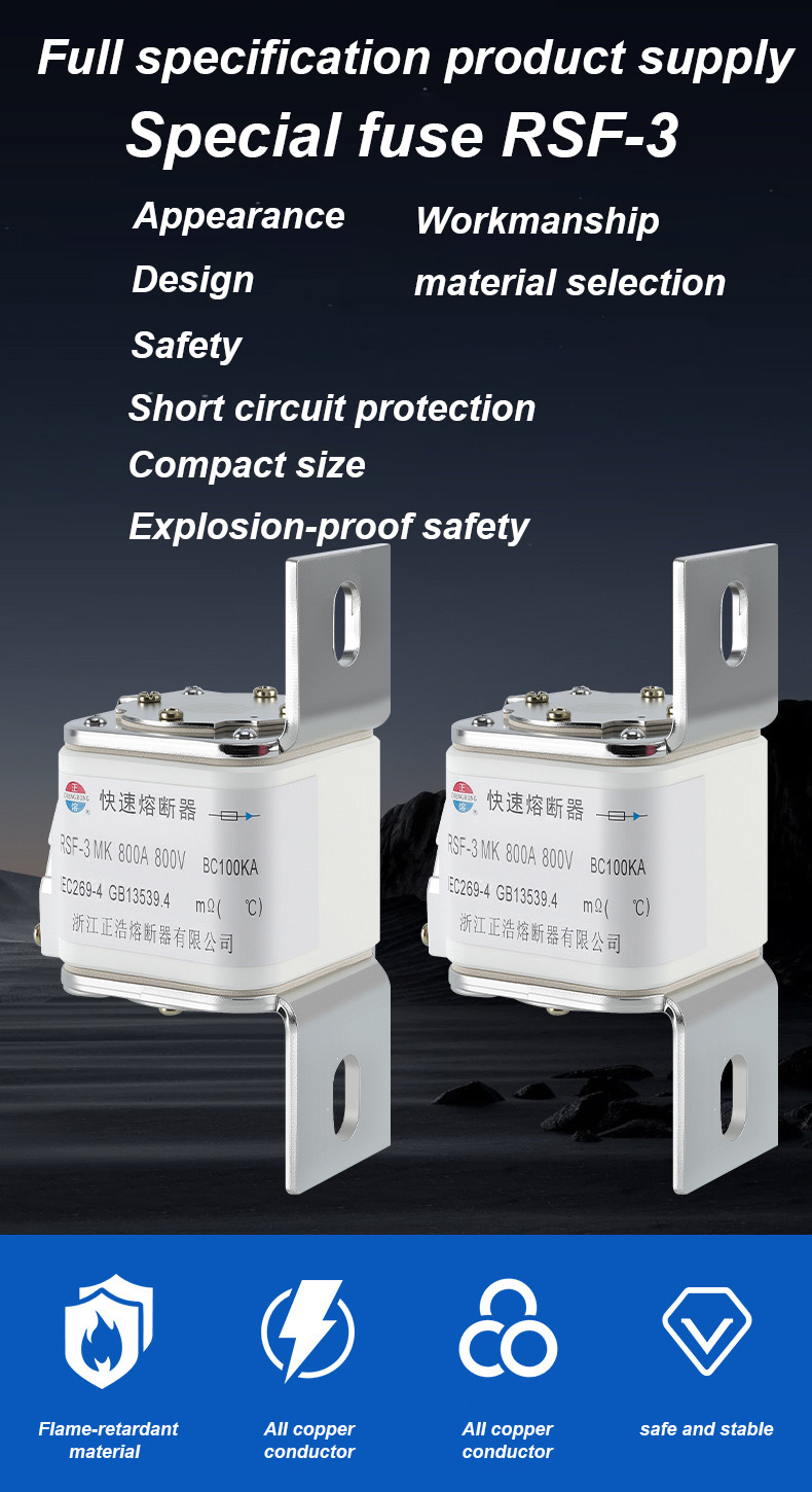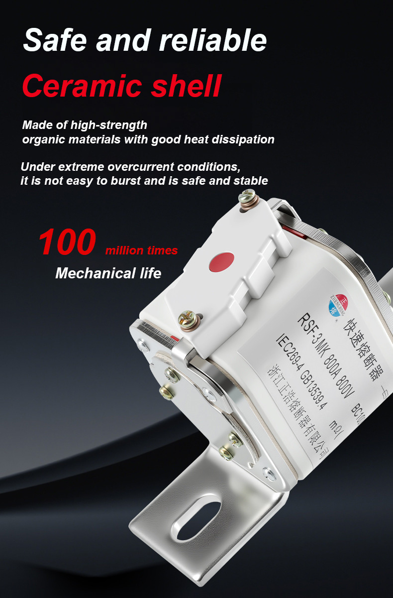 500V चा रेट केलेला व्होल्टेज आणि 315A रेट केलेला प्रवाह आहे, जो प्रभावीपणे विद्युत सुरक्षितता सुनिश्चित करू शकतो, ओव्हरलोड आणि शॉर्ट सर्किट टाळू शकतो. RSF-3MK 800V-800A BC100KA फ्यूज लिंक्स