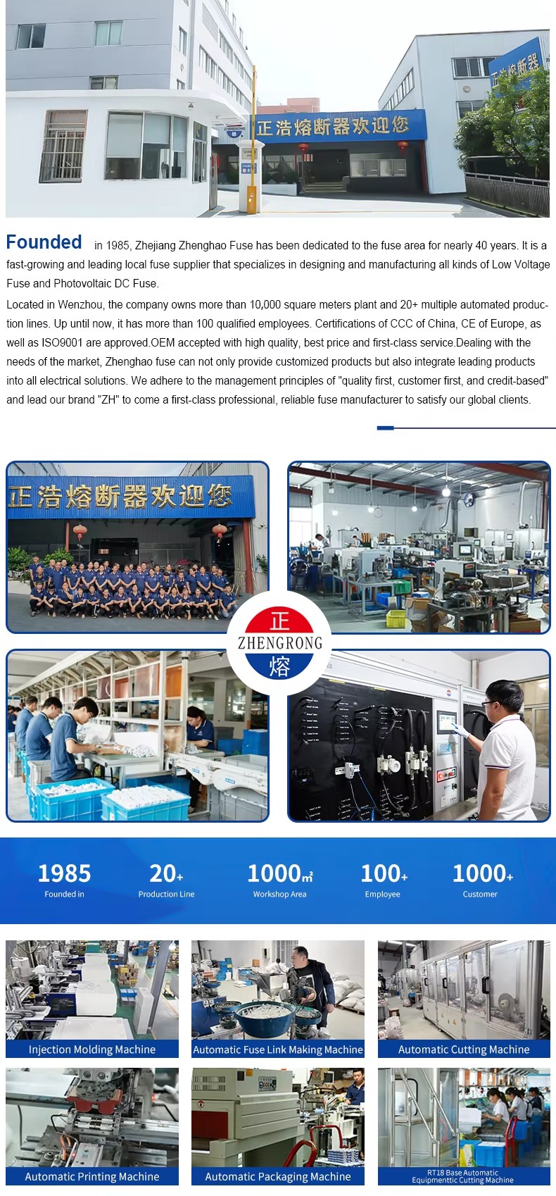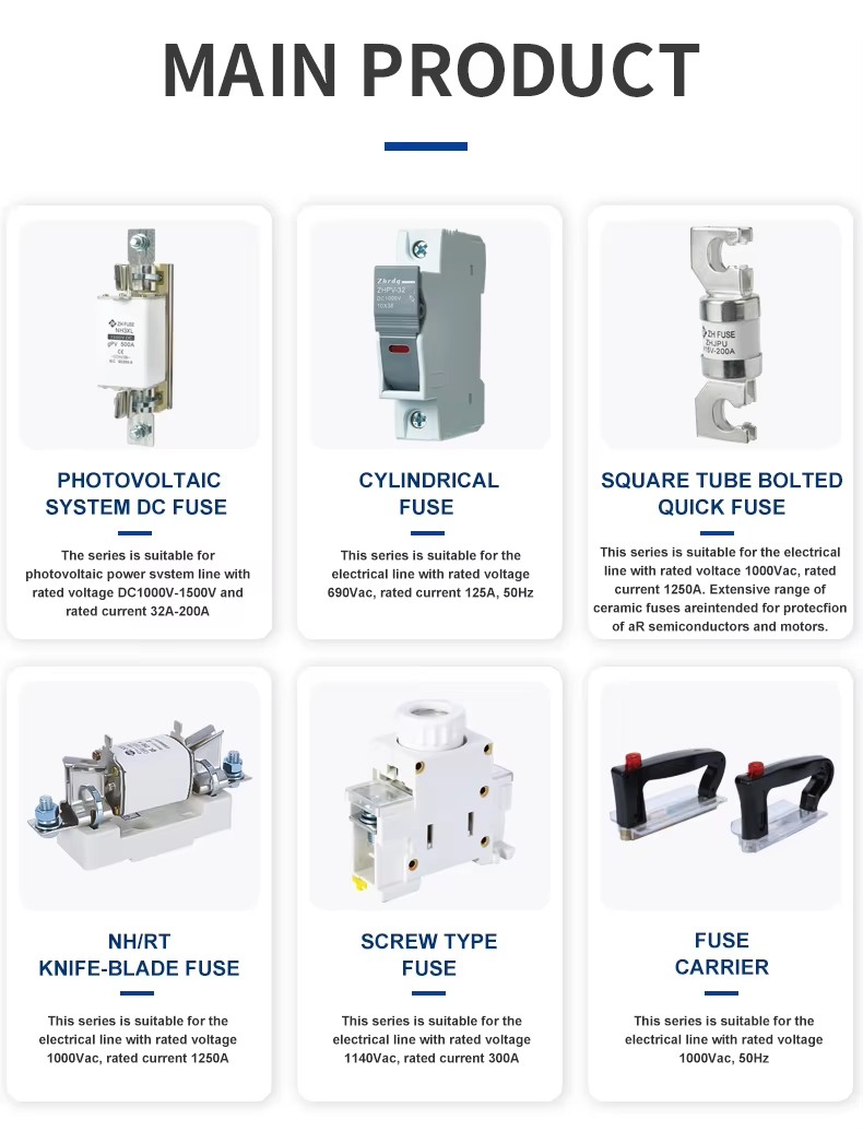 झेडएचपीव्ही -125 1000 व्ही डीसी फ्यूज बेस आणि फ्यूज लिंकची स्ट्रक्चरल वैशिष्ट्ये 22 × 58 मिमी दंडगोलाकार सिरेमिक फ्यूज तळाशी फोटोव्होल्टिक सिस्टममध्ये खालीलप्रमाणे आहेत. फ्यूजच्या या मालिकेमध्ये फ्यूज लिंक आणि फ्यूज धारक असतात. शुद्ध तांबे शीट (किंवा तांबे वायर, चांदीच्या वायर, चांदीच्या चादरी) पासून बनविलेले व्हेरिएबल क्रॉस-सेक्शन फ्यूज बॉडी उच्च-सामर्थ्य सिरेमिक किंवा इपॉक्सी ग्लास क्लॉथ ट्यूबने बनविलेल्या फ्यूज ट्यूबमध्ये सीलबंद केले जाते, जे रासायनिकदृष्ट्या उपचारित उच्च-शुद्धता क्वार्ट्ज वाळूने एक चाप विझविणार्या मध्यम म्हणून भरलेले आहे. फ्यूज कोअरच्या दोन बाजू स्पॉट वेल्डिंगद्वारे शेवटच्या प्लेटशी विश्वसनीयरित्या जोडल्या जातात, ज्यामुळे दंडगोलाकार कॅप आकाराची रचना तयार होते. झेडएचपीव्ही -125 1000 व्ही डीसी फ्यूज बेस इलेक्ट्रिक शॉकसह दाबलेल्या राळ किंवा प्लास्टिकच्या शेलपासून बनलेला आहे, ज्यामध्ये फ्यूज घटकासह योग्य आकाराच्या फ्यूज बॉडी घटकासाठी समर्थन म्हणून रिव्हेटिंगद्वारे जोडलेले आहे. फ्यूजच्या या मालिकेमध्ये लहान व्हॉल्यूम, सुलभ स्थापना, सुरक्षित वापर आणि सुंदर देखावाचे फायदे आहेत.